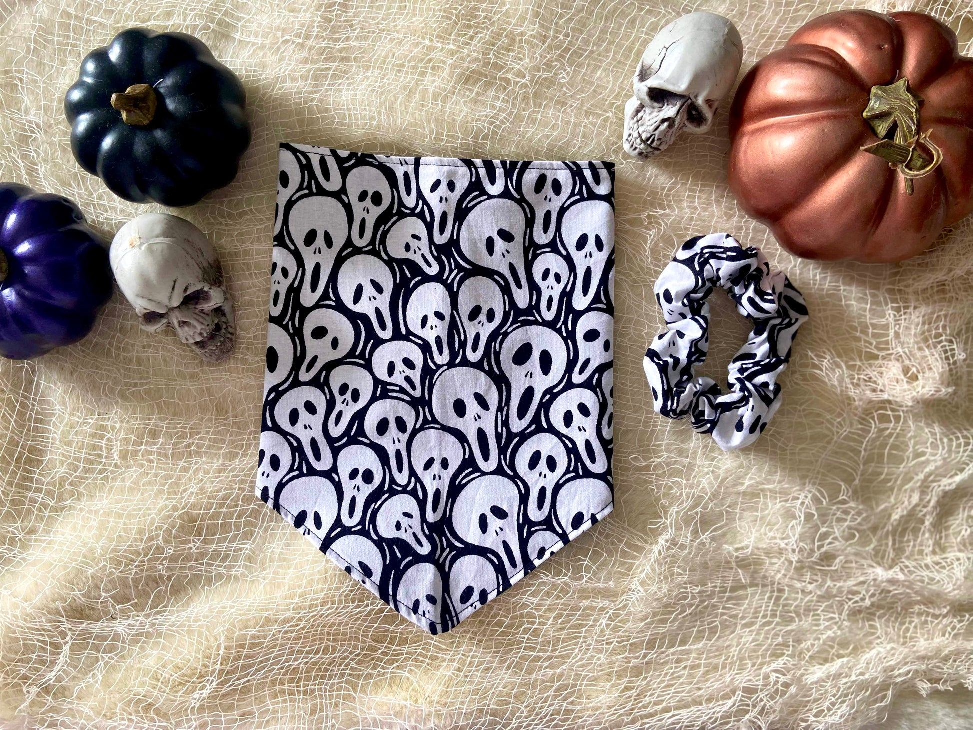 Halloween 2023 double sided tie up pet bandanna, printed fabric with complementary print on reverse side so you can keep wearing your bandanna all year round!