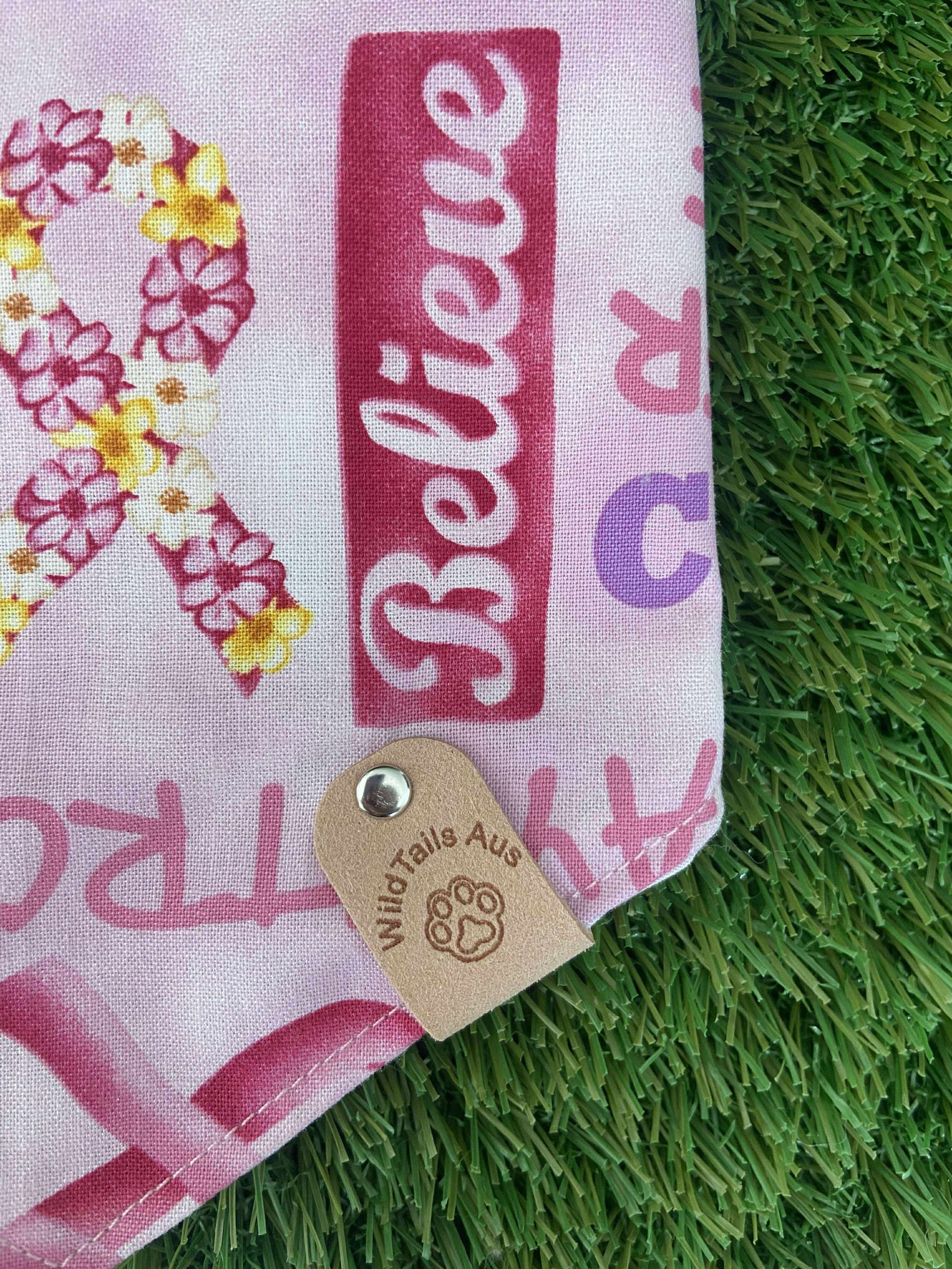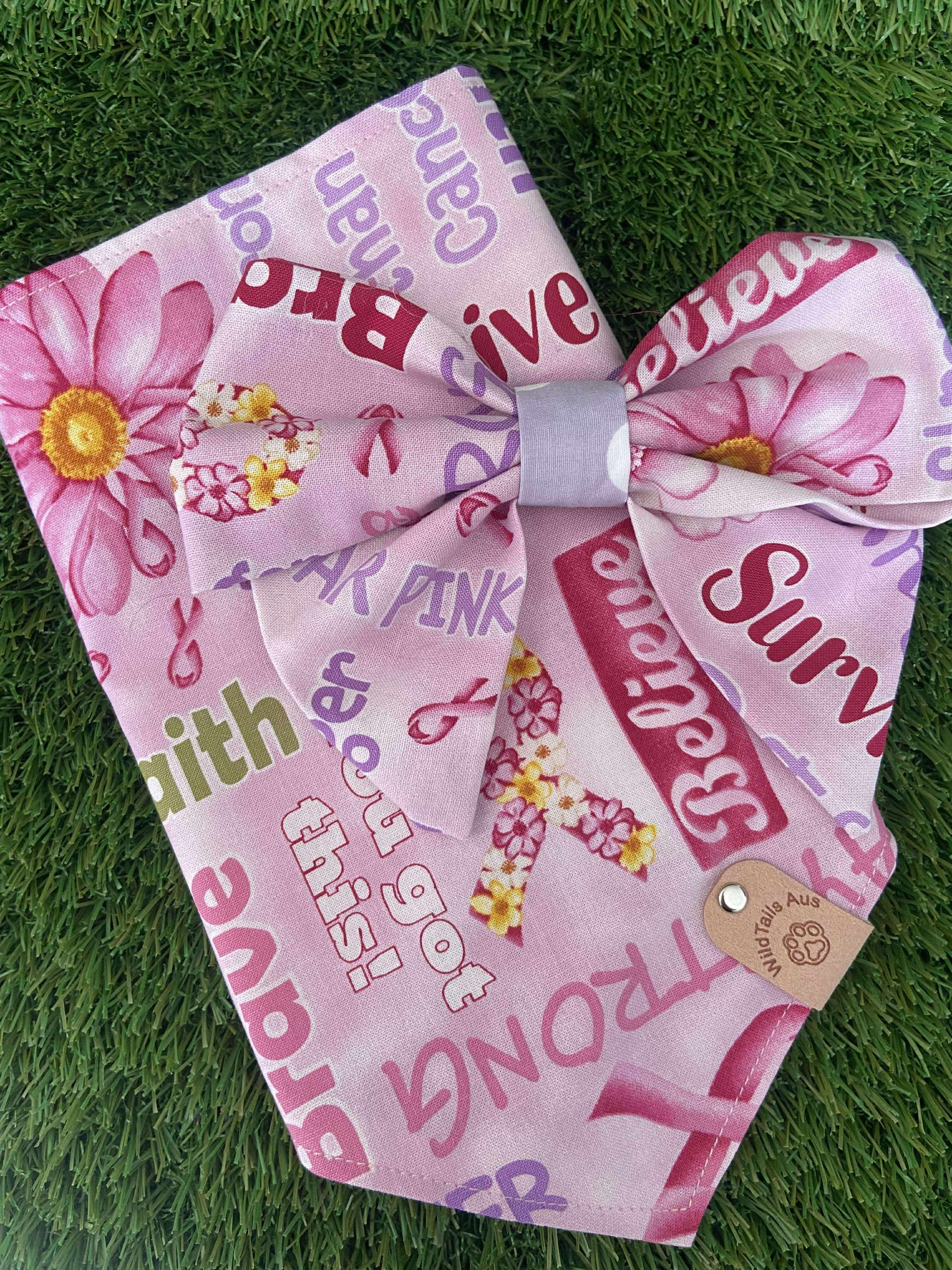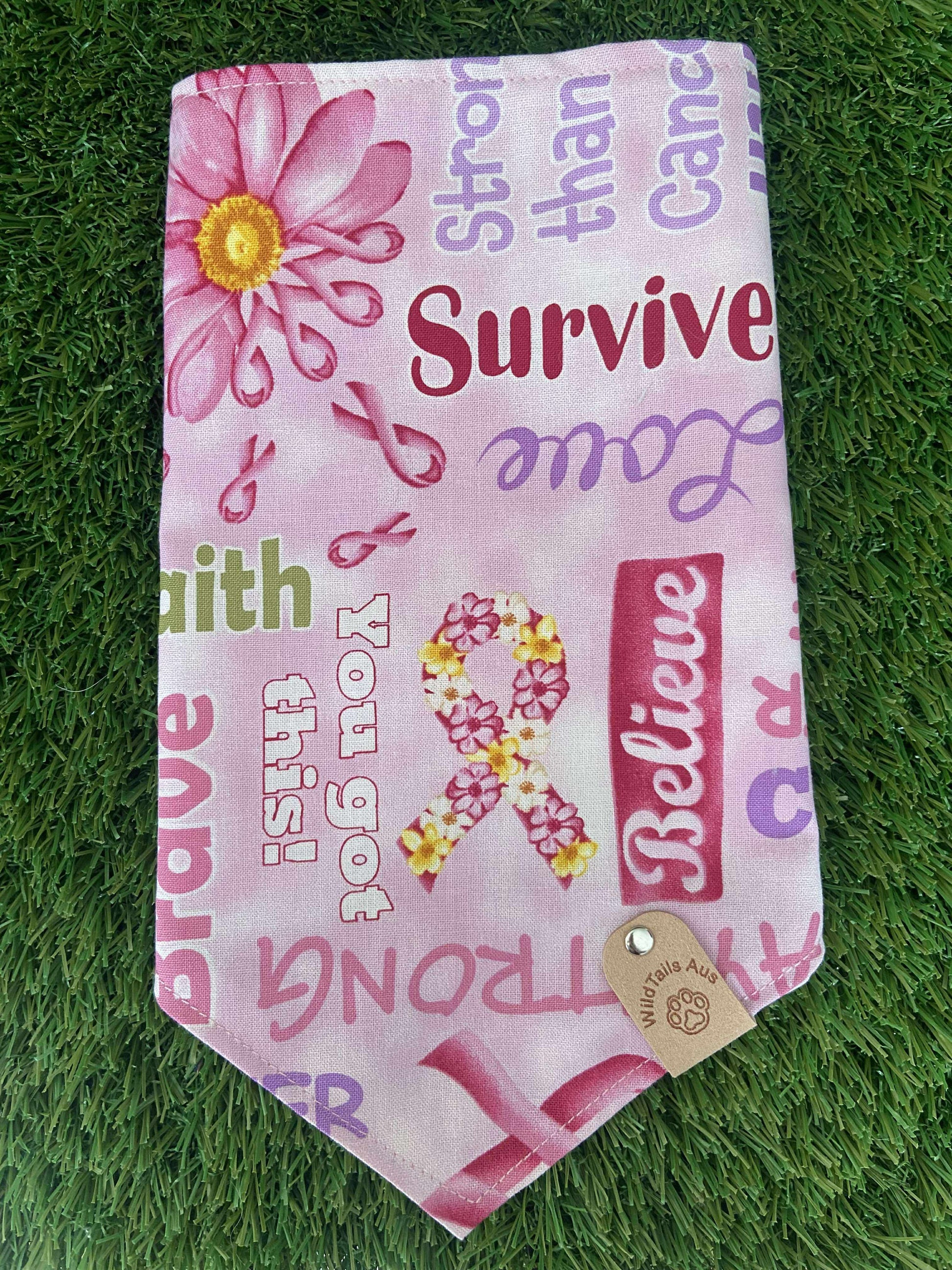 Stronger than cancer double sided tie up pet bandanna, pink print with quotes and complementary solid colour on reverse side (perfect for customisation).